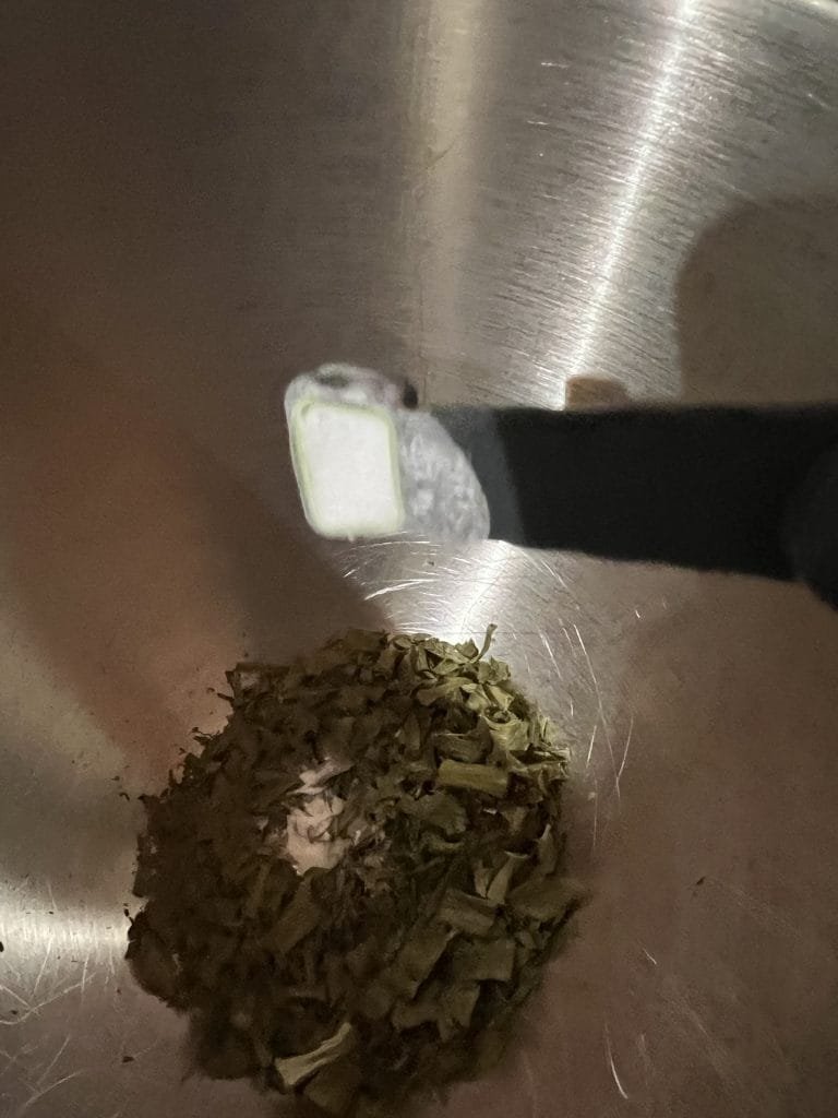 I don’t have any dried onions or a soup packet, so I’m going to use a mixture of my dried chives and dried green onions. I’m going to add about a tablespoon of each to my mixing bowl. I normally just crunched them up in my hand.