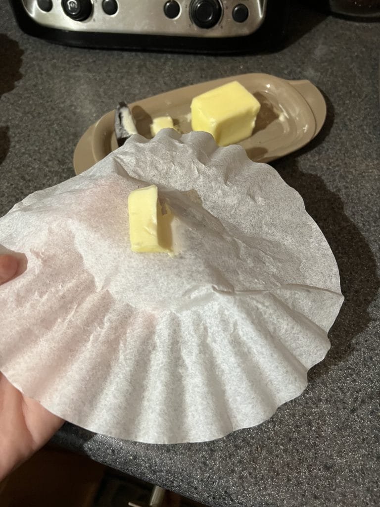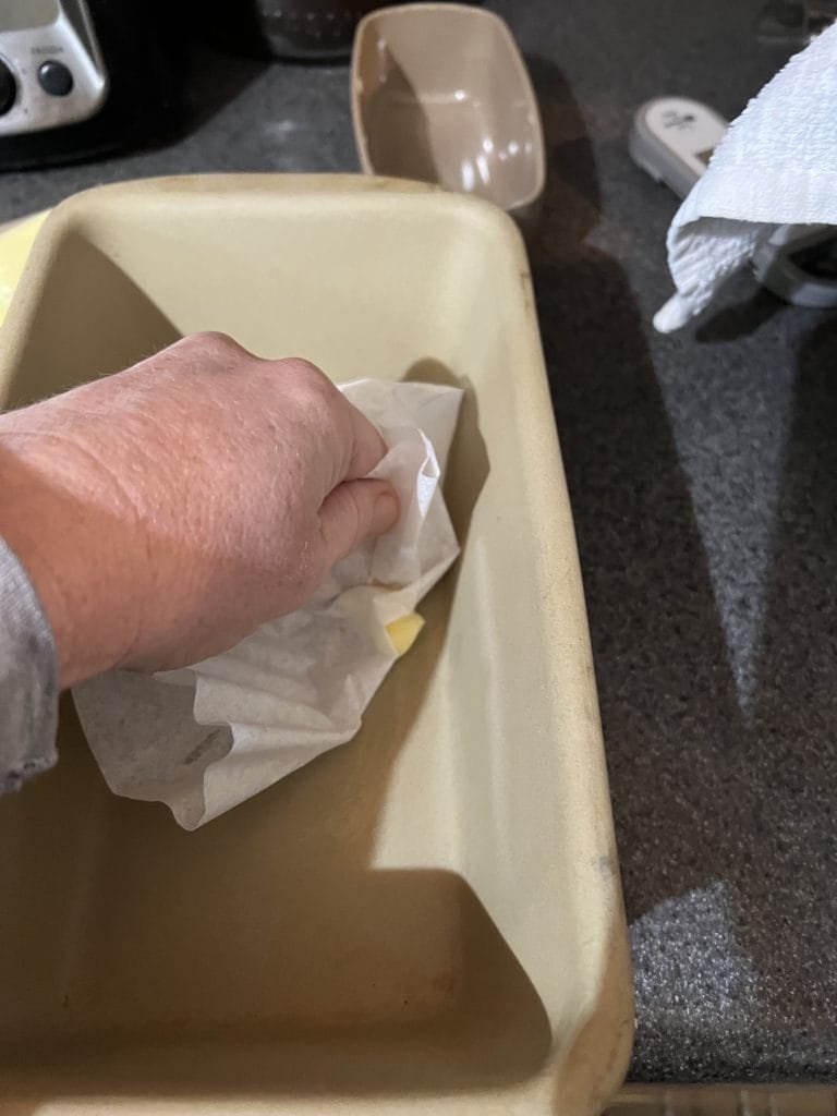 When your hour rise time is getting close, you’ll need to prepare your bread pan by buttering it. I just use a coffee filter and about a teaspoon of butter. I start in the corners and then spread it all out evenly.