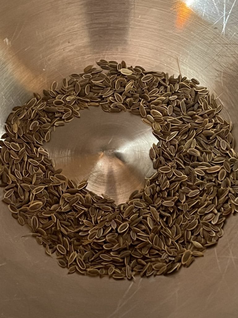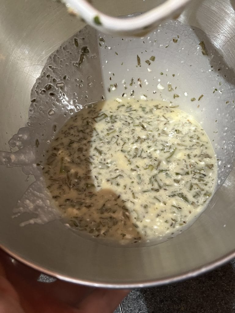 Now , I’m going to add my herbs and 2 teaspoons dill seeds into my mixer bowl. The Dilly Onion Bread recipe doesn’t call for salt in the dough but since I used unsalted butter, I added 1/4 tsp salt at this stage of dough making.